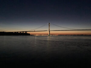 Doch die Kälte kriecht langsam in mir hoch. Gerade als ich sie bemerke und eine Teilnehmerin und ich uns zum wiederholten Male nach einem großen Gähner meinerseits verschmitzt angrinsen, merke ich, wie auch meine Augenlider schwer werden. Dabei sollen es noch gute zwei Stunden bis zum Sonnenaufgang sein, den ich so gerne sehen würde. Kurz überlege ich, mich in meinem Ölzeug auf dem Vordeck zusammenzurollen und mich an den dort gesicherten Klüver zu kuscheln. Doch das regelmäßige Tuckern des Motors lockt mich mehr. Schon mehrfach beneidete ich die schlafende Wache 1 im Vorschiff. Das Gefühl, dort zu liegen, während die Mytilus vor sich hintreibt, muss sich in meiner Kindheit eingebrannt haben. Und nun als Anwärterin hätte ich dafür den Premium-Platz: Die Koje direkt am Motor. Die kurze Zahnputz-Session auf dem Vordeck dehnt sich um das Zehnfache aus, denn obwohl wir sie schon seit dem Ankerplatz sehen konnten, öffnet sich nun die letzte Schleife hin zu den beiden Lillebælt-Brücken: die »Gamle Lillebæltsbro« aus 1935 und die »Nye Lillebæltsbro« aus 1970 mit einer Länge von 1.700 Metern. Gemeinsam mit einem der rund 3.000 im Kleinen Belt lebenden Schweinswale tauchen wir unter der älteren Brücke hindurch, über die gerade ein Zug rollt. Es ist 02:30 Uhr, bisher sind wir keinem anderen Schiff begegnet. In Skærbæk, Middelfart, Erritsø, Fredericia, die die Meeresenge umgebenen Städte, sehe ich viele Lichter, aber keine Menschen. Die knapp drei Kilometer bis zur neuen Brücke höre ich einzelne Trucks die Brücke queren. Ihre Scheinwerfer gleiten über uns hinweg, als wir 42 Meter unter ihnen die Fahrbahn kreuzen. Mein Architekturherz hält das sonst tief in der Koje vergrabene Handy bereit. Dieses Ereignis will ich stolz in der Heimat präsentieren können.